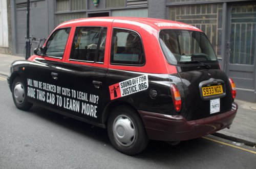 Kuomet Jungtinės Karalystės valdžia pateikė pasiūlymą panaikinti nemokamą juridinę pagalbą (angl. Legal Aid) baudžiamojo proceso byloms bei taip sutaupyti 300 milijonų svarų sterlingų, „Sound Off Justice“ kampanijos komanda nutarė į Londono juoduosius taksi įtaisyti „iPad“ planšetes ir „iPhone 4“ išmaniuosius telefonus. Taip jie žada kovoti prieš naujosios pertvarkos pasiūlymą.